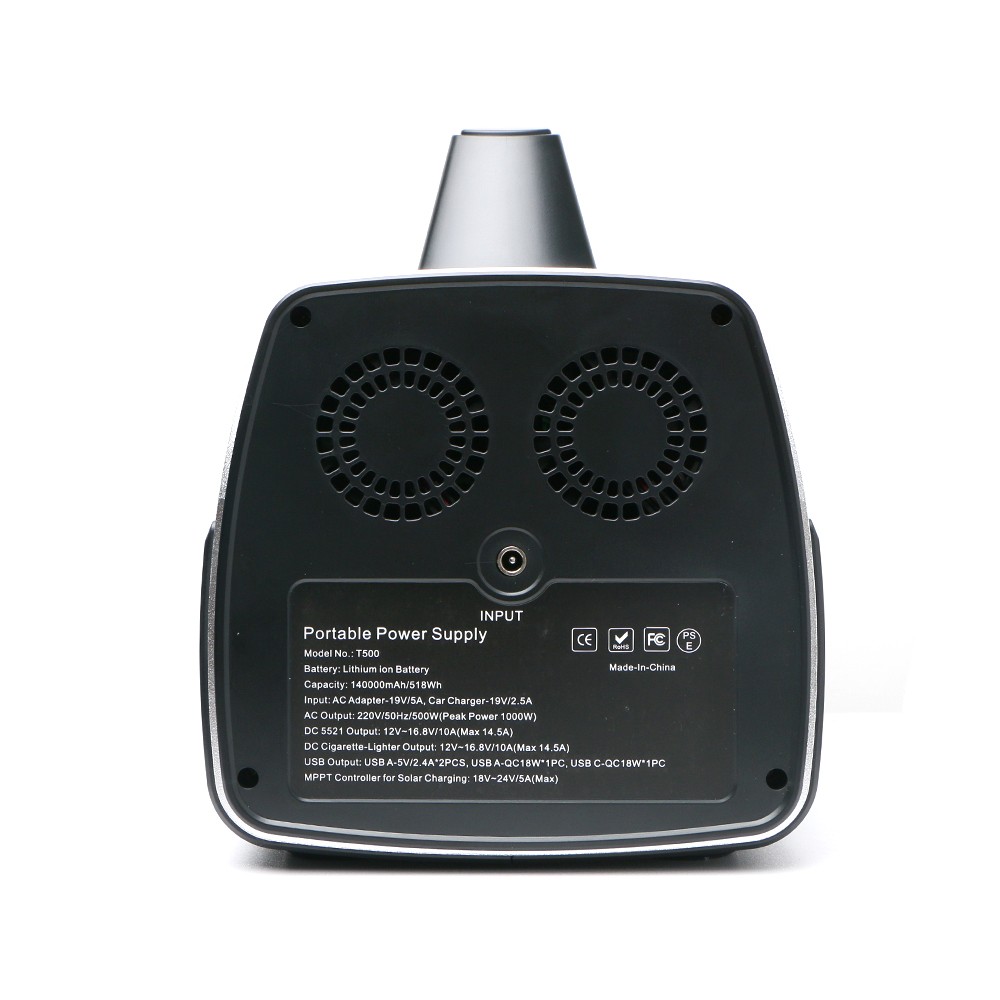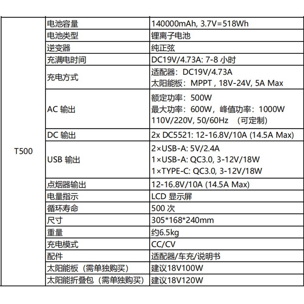 电池容量 140000mAh, 3.7V=518Wh 电池类型 锂离子电池 额定功率:500W 最大功率:600W,峰值功率:1000W 110V/220V, 50/60Hz (可定制) 电量指示 LCD 显示屏 循环寿命 500 次 尺寸 305*168*240mm 重量 约6.5kg