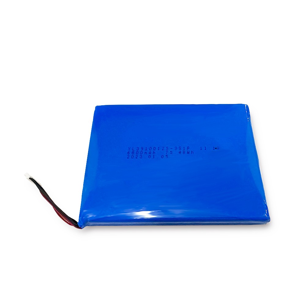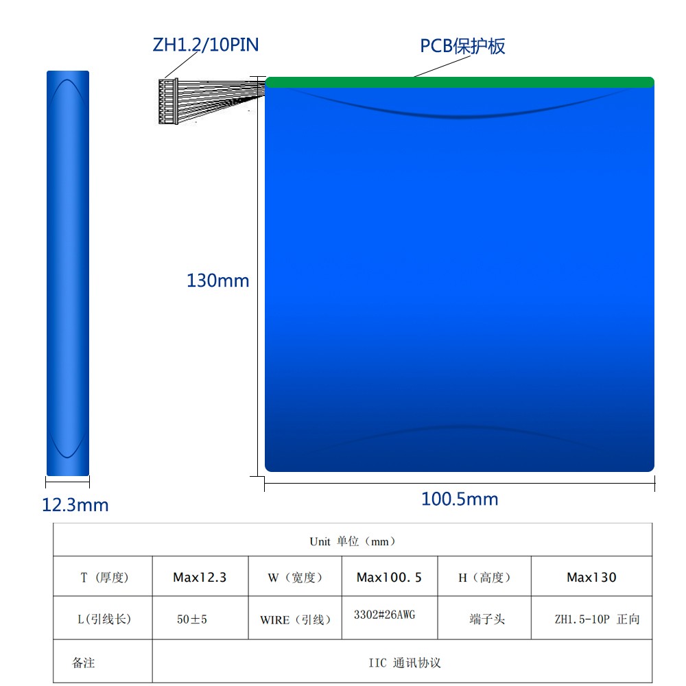 3.7V6800mAh 工业平板51漫画 电芯型号:39100125/3.7V/6800mAh 电池规格:39100125/11.1v/6800mAH 标称电压:11.1V 标称容量:6800mAh 充电电压:12.6V 标准充电电流:1360mA 标准放电电流:1360mA 瞬间放电电流:3200mA瞬间(5A) 放电截止电压:9V 成品内阻:200mΩ 电池重量:335g 产品尺寸:12.3*100.5*130mm(Max) 充电温度:0~45℃ 放电温度:-20~60℃ 存储温度:-0~35℃ 电池外壳:无 锂电保护:过冲/过放/短路/过流/i2C电量协议 51漫画领域:工业平板