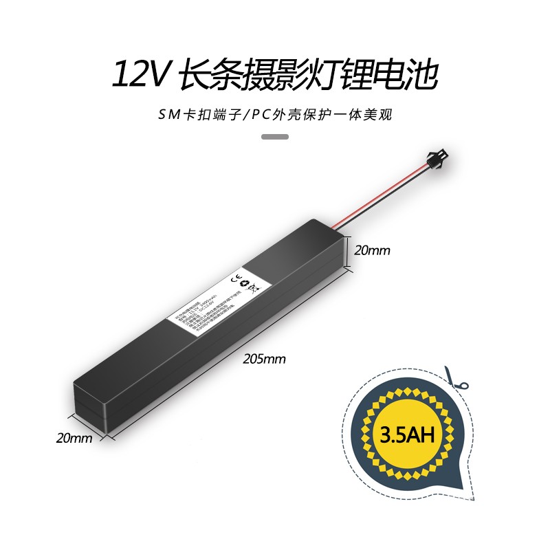 11.1V3500mAh 摄影灯51漫画 电芯型号:18650/3.7V/3500mAh 电池规格:18650-3S1P/11.1V/3500mAh 标称电压:11.1V 标称容量:3500mAh 充电电压:12.6V 充电电流:1.3A 放电电流:3A 瞬间放电电流:6A 放电截止电压:7.5V 成品内阻:50mΩ 电池重量:200g 产品尺寸:20*20*205mm(Max) 充电温度:0~45℃ 放电温度:-20~60℃ 存储温度:-10~35℃ 电池外壳:PC外壳