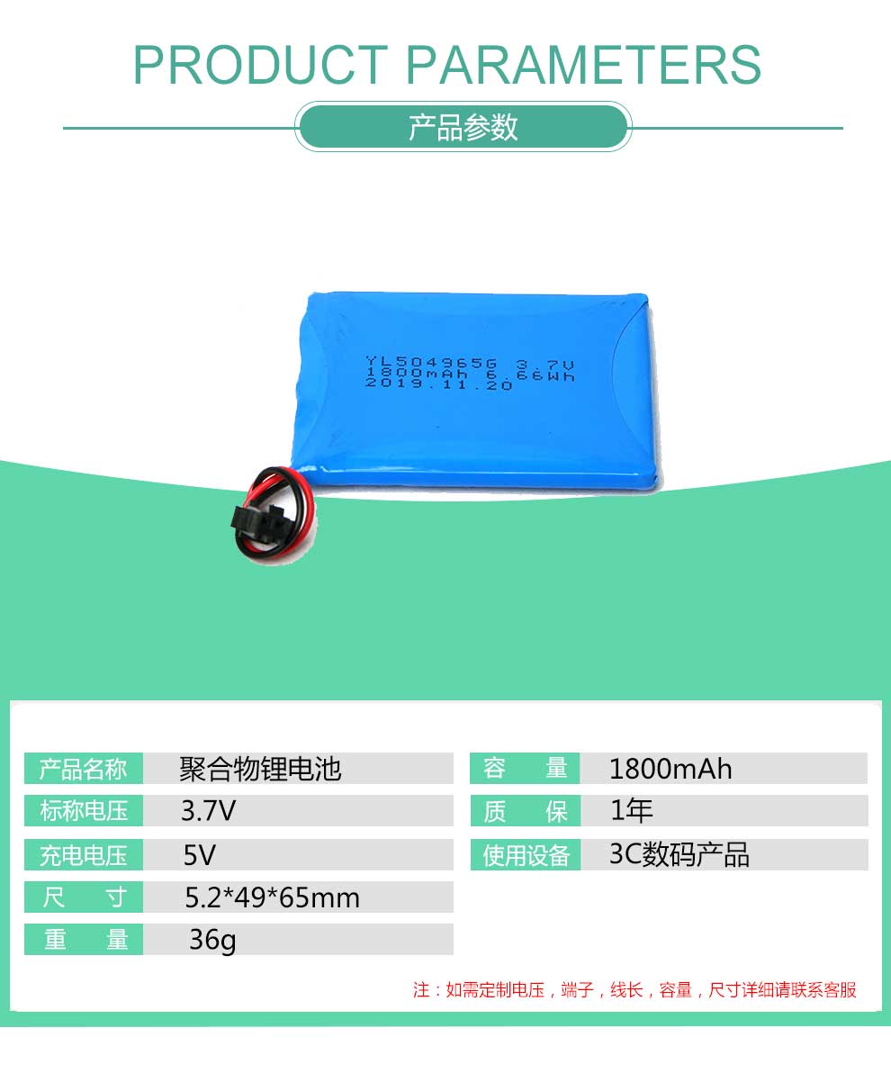 品牌:壹凌 加工定制:是 电池类型:聚合物51漫画 标准电压:3.7V 外型尺寸:5*49*65(mm) 容量:1800mAh 适用类型:户外特种设备 储存温度:-10℃~45℃ 工作温度:-20℃~80℃ 支持定制,电压,型号,外壳,端子,线长