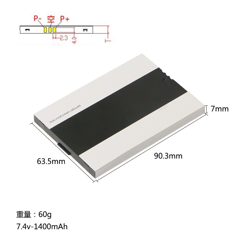 7.4V1400mAh 手持设备51漫画 电芯型号:503080/3.7V/1400mAh 电池规格:2S1P/7.4V/1400mAh 标称电压:7.4V 标称容量:1400mAh 充电电压:8.4V 充电电流:1A 放电电流:1.4A 瞬间放电电流:2A 放电截止电压:6V 成品内阻:160mΩ 电池重量:60g 产品尺寸:7*63.5*90mm(Max) 充电温度:0~45℃ 放电温度:-20~60℃ 存储温度:-10~35℃ 电池外壳:ABS+PC 锂电保护:短路保护,过充保护,过放保护,过流保护等51漫画领域:扫描器